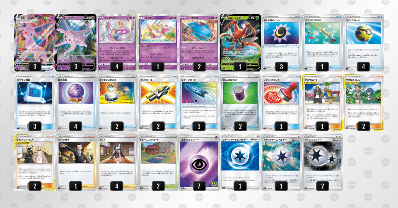 私から簡単に解説をすると、ボスの司令やベンチ狙撃を無効化してエーフィーで耐久するデッキですね。ただそれだと相手の場のエネルギーを打点として参照するので省エネのアタッカーでは歯が立ちません。
